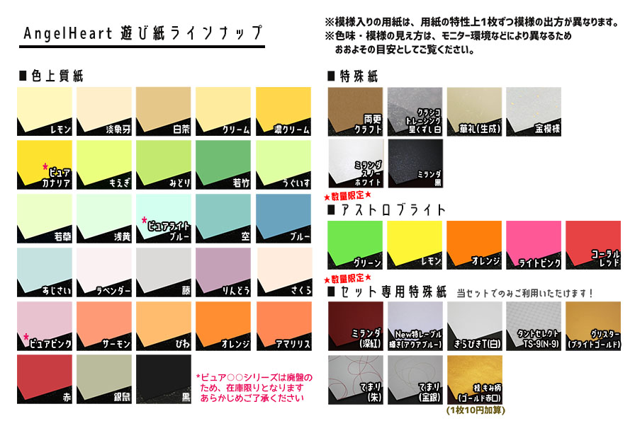 ■遊び紙(有料) 弊社常設ラインナップ内の遊び紙 当セット限定特殊紙 1冊につき20円…きらびき 白T-70・タントセレクトTS-9(N-9) 1冊につき30円…ミランダ(深紅)・グリスター(ブライトゴールド) 1冊につき35円…New特レーブル輝き(アクアブルー)・てまり(朱)・てまり(金銀) 1冊につき45円…桂 もみ柄(ゴールド赤口) 前後で使用する場合は上記価格の2倍(前と後ろで2枚分)になります。 また、数量限定のため、在庫限りの取り扱いとなります。在庫がご注文部数に満たない場合、用紙変更のお願いをさせていただく場合がございます。あらかじめご了承ください。 ▼遊び紙ラインナップ(画像クリックで拡大) ![]() ※てまりは用紙が薄く柔らかいため、保管時に上下に重なっていた糸の跡がつきます。 また、糸はランダムに漉き込まれているため、金銀につきましては断裁した際に糸が金のみ・銀のみに偏ることがございます。 ![]() いずれも商品仕様としてご了承ください。 ■PP加工各種(有料) クリアPP・マットPP加工 ホログラムPP各種 ※アートポスト180Kgのみの対応 和紙PP ※アートポスト220Kgのみの対応 ■スジ入れ製本(有料) ■カラー口絵(有料/追加納期あり) ■表紙2-3印刷(有料/追加納期あり) |