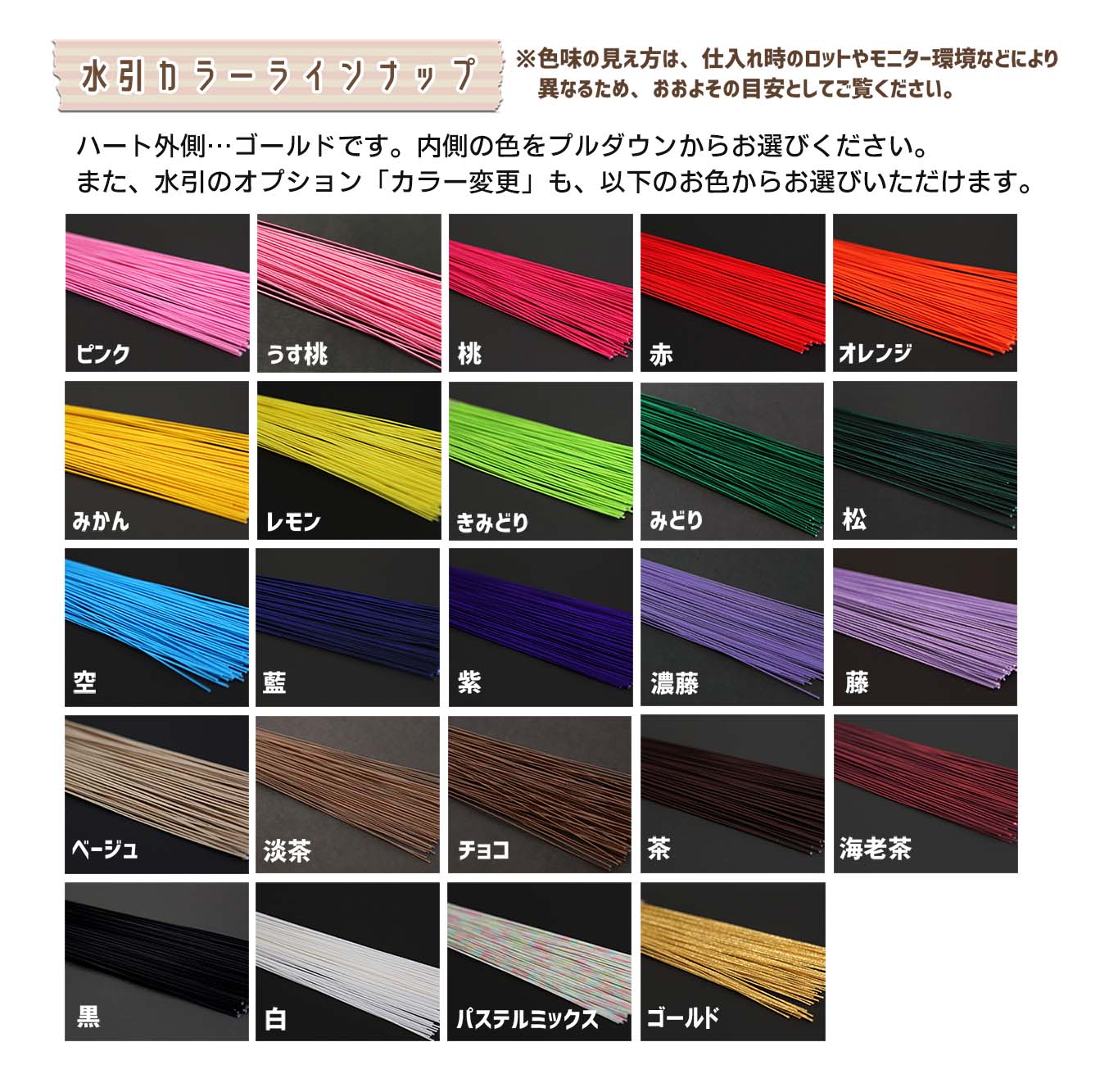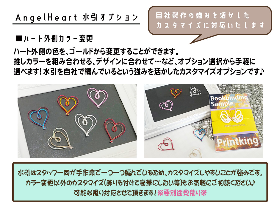 天使の羽根付きのハートの水引がセットに含まれています。![]() ハート外側…ゴールドが基本の配色となっています。ハート内側のカラーをお選びください。 ピンク・うす桃・桃・赤・オレンジ・みかん・レモン・きみどり・みどり・松 空・藍・紫・濃藤・藤・ベージュ・淡茶・チョコ・茶・海老茶・黒・白・パステルミックス ※羽根はラメ白・白の色固定となっております。羽根の色を変更したい場合は追加納期が必要となりますので、事前にご相談ください。 ▼水引カラーラインナップ(画像クリックで拡大) ![]() ▼オプション ハート外側カラー変更 ハートをお好きな色で作成が可能です。 (外側の金色を違う色に変更するオプションとなります) 「水引カラー変更」のオプションから色をご選択ください。 内外を同じ色にすることも可能です。 カラー変更サンプル(画像クリックで拡大) ![]() ※水引の取り付けについて 冊子は重ねた状態での包装となります。水引の跡(へこみ等)が冊子についてしまうのを防止するため、取り付けはせずに納品させていただきます(書店・ご本人様以外受け取りの場合も同様) OPP袋にまとめて封入・冊子と同梱いたします。 取り出す際、強く引っ張ると水引が破損する恐れがありますので、優しく取り出してください。 ![]() 水引にゴムがついているため、取り付けはどなたでも簡単にできるようになっています。 跡がつくことをご了承の上、取り付けた状態での納品を希望される場合は備考欄にてお知らせください。 ※予備について 水引の予備はお付けいたしますが、ご注文部数に関わらず1~3個の同梱となります。 冊子の予備数と個数が異なる場合がございますが、仕様としてご了承ください。 |
