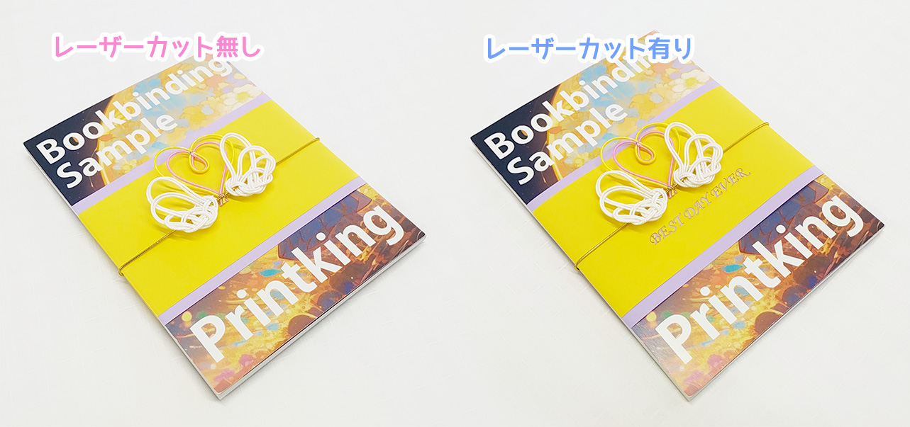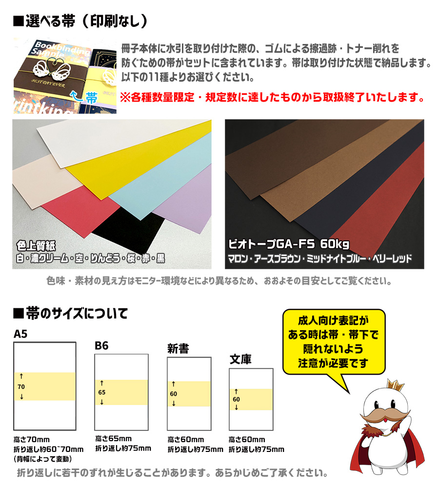 冊子本体に水引を取り付けた際のゴムによる擦過跡・トナー削れを防ぐための帯がセットに含まれています。 11種よりお選びください。 色上質紙…白・濃クリーム・空・りんどう・さくら・赤・黒 ≪追加料金10円/部≫ ビオトープGA-FS 60kg…マロン・アースブラウン・ミッドナイトブルー・ベリーレッド ※各種数量限定・規定数に達したものから取扱終了いたします。 在庫状況により、再販・増刷の際に同じ用紙をご利用いただけない場合がございます。あらかじめご了承ください。 原則、冊子の中央に取付した状態で納品いたします。 【サイズについて】 高さ A5…70mm・B6…65mm・新書…60mm・文庫…60mm 折り返し幅 A5…60~70mm(背幅によって変動します)・B6…75mm・新書…75mm・文庫…75mm ▼帯についての詳細(画像クリックで拡大) ![]() 帯がかかる部分は表紙のデザインが隠れます。 隠れてはいけないデザインはカバーの高さ部分を考慮して配置していただくことをおすすめいたします。 また、成人向け作品の場合、成人向けマーク等がカバーで隠れてしまう配置はデータ不備扱いとなるため、ご留意くださいますようお願い申し上げます(タイトル文字やイラスト部分への帯被りはデータチェックの対象外です) ▼オプション レーザーカットメッセージ 帯下部にレーザーで簡単なメッセージを入れられます。(大文字アルファベット+指定の記号のみ・最大16文字) 定型のフォント3種からお好きなフォントを選択の上、備考欄に入れたいメッセージをご記載ください。 ※記号は一覧に掲載されているもののみカット可能です。 記号をそのまま入力すると文字化けの恐れがありますので、入れたい箇所に記号の「番号」か「名称」を記載してください。 ※セット料金のため、レーザーカットなしの場合でもお値引きはできません。あらかじめご了承ください。 ※レーザーでカットするため、色合いの薄い用紙は焦げ跡・ヤニが目立つ場合があります。 レーザーカットサンプル(画像クリックで拡大) ![]() ![]() |