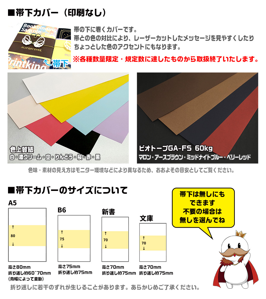 帯の下に巻くカバーです。帯との色の対比により、レーザーカットを見やすくすることができます。 「不要」とすることもできますが、セット料金のためお値引きはできません。あらかじめご了承ください。 11種よりお選びください。 色上質紙…白・濃クリーム・空・りんどう・さくら・赤・黒 ≪追加料金10円/部≫ ビオトープGA-FS 60kg…マロン・アースブラウン・ミッドナイトブルー・ベリーレッド ※各種数量限定・規定数に達したものから取扱終了いたします。 在庫状況により、再販・増刷の際に同じ用紙をご利用いただけない場合がございます。あらかじめご了承ください。 原則、冊子の中央に取付した状態で納品いたします。 【サイズについて】 高さ A5…80mm・B6…75mm・新書…70mm・文庫…70mm 折り返し幅 A5…60~70mm(背幅によって変動します)・B6…75mm・新書…75mm・文庫…75mm ▼帯下カバーについての詳細(画像クリックで拡大) ![]() カバーがかかる部分は表紙のデザインが隠れます。 隠れてはいけないデザインはカバーの高さ部分を考慮して配置していただくことをおすすめいたします。 また、成人向け作品の場合、成人向けマーク等がカバーで隠れてしまう配置はデータ不備扱いとなるため、ご留意くださいますようお願い申し上げます(タイトル文字やイラスト部分への帯被りはデータチェックの対象外です) |