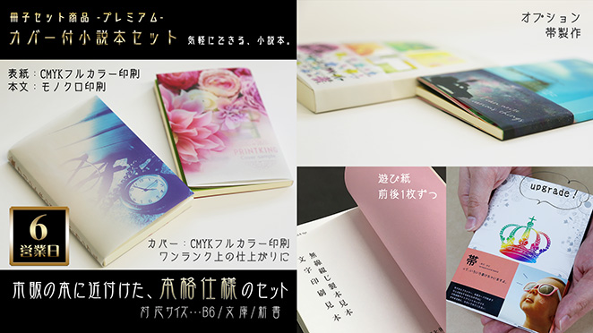 新書・文庫サイズの冊子のセット商品です。フルカラーのカバーがセットに含まれています(一部のカバーは追加料金有)帯やカラー口絵をオプションで追加することもできます。